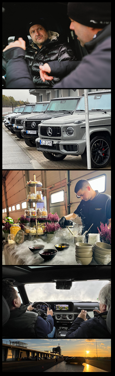 Impressionen vom Luxury Driving Event am Sachsenring. Ganz oben eine Aufnahme der Fahrzeugeinweisung, darunter die G-Klassen Modelle aufgereiht, ein Foto vom einzigartigen Catering, eine Aufnahme von der G-Klassen experience mit blick aus dem Cockpit in den Himmel und zu guter Letzt der Sachsenring im Sonnenuntergang. [Mercedes-Benz G 580 mit EQ Technologie | Energieverbrauch kombiniert: 30,3-27,7 kWh/100 km | CO2;-Emissionen kombiniert: 0 g/km | CO2;-Klasse: A] [Mercedes-AMG G 63 | Energieverbrauch kombiniert: 15,7-14,7 l/100 km | CO2;-Emissionen kombiniert: 358-335 g/km | CO2;-Klasse: G]