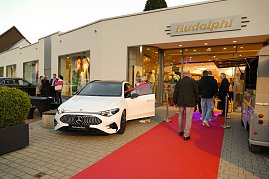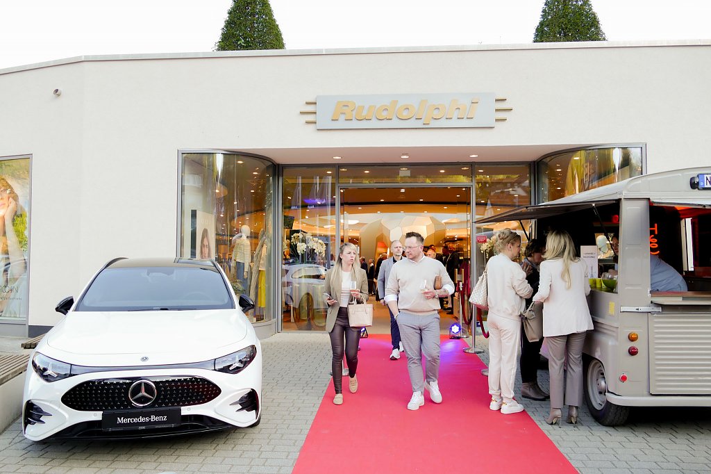 Nach einem entspannten Ankommen eröffnete Moderator René Pfeuffer (Media Balance) gegen 19 Uhr offiziell den Abend. In ihren Begrüßungsworten hoben die Gastgeber ein besonderes Jubiläum hervor: 140 Jahre Automobilbaukunst von Mercedes-Benz als Erfinder des Automobils treffen auf 150 Jahre Tradition des Modehauses Rudolphi – eine Verbindung von Innovation und Beständigkeit.