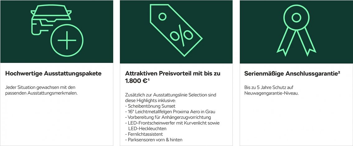 ² 36 Monate Garantieverlängerung im Anschluss an die zweijährige Herstellergarantie mit der ŠKODA Anschlussgarantie der Škoda Auto a.s., mit Sitz in Václava Klementa 869, Mladá Boleslav II, PLZ: 293 01, Mladá Boleslav, Tschechische Republik, bei einer Gesamtfahrleistung von 50.000 km. Die Leistungen entsprechen, mit Ausnahme der Lack- und Karosseriegarantie sowie der Škoda Garantie für Hochvoltbatterien in BEV - und PHEV-Fahrzeugen, dem Umfang der Herstellergarantie. Weitere Informationen erhalten Sie bei uns vor Ort im Autohaus oder unter www.skoda-auto.de/service/anschlussgarantie