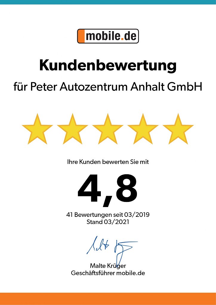 Auch die Peter Autozentrum Anhalt GmbH gehört mit durchschnittlich 4,6 von 5 Sternen zu den besten Autohäusern in Sachsen-Anhalt. Die Urkunde von Autoscout24 erhielt sie Anfang Januar für ihre Verkaufserfahrung im Transporter-Bereich am Standort Dessau.