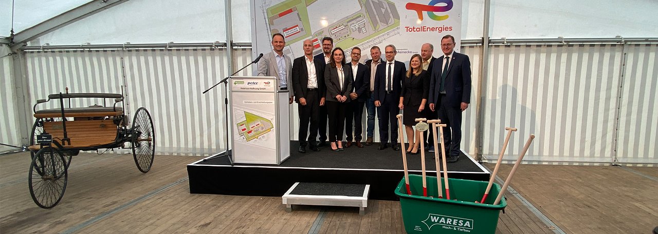 Thüringens Ministerpräsident Bodo Ramelow (Die Linke), Innenminister Georg Maier (SPD), Investor Andreas Peter (Peter-Gruppe), Investor Silvio Wagner (Baufirma Waresa), Landrat Matthias Jendricke (SPD), Werthers ehemaliger Bürgermeister Hans-Jürgen Weidt (pl) und Christian Cabrol (Total Energies Deutschland) beim symbolischen Spatenstich für den Neubau des Autohofs in Werther.