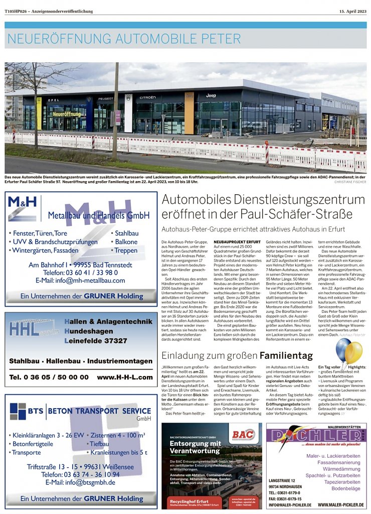 Im März 2022 war der Umzug geplant. Daraus wurde nichts. Die Baugenehmigung der Stadt ließ auf sich warten. Und die Zeit drängte. Denn der Mietvertrag war abgelaufen und jeder Monat mehr musste teuer bezahlt werden. Nun ist es vollbracht. Am 22. April 2023 wird das neue Autohaus, wohl das größte mit Abmaßen von 95 Metern Länge, 50 Metern Breite und sieben Metern Höhe, feierlich eröffnet. 120 Arbeitsplätze wird es hier künftig geben. Helmut Peter hat die Belegschaft für sein 7-Marken-Haus – Opel, Peugeot, Jeep, Citroën, Suzuki, später noch die Stellantis-Premiummarken DS, Alfa Romeo und Lancia – von 75 auf 120 kräftig aufgestockt.