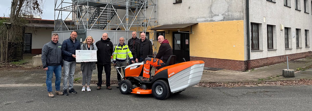 Mehrere Personen vor einem Gebäude, eine Person sitzt auf einem Rasentraktor, eine weitere hält einen großen Scheck.